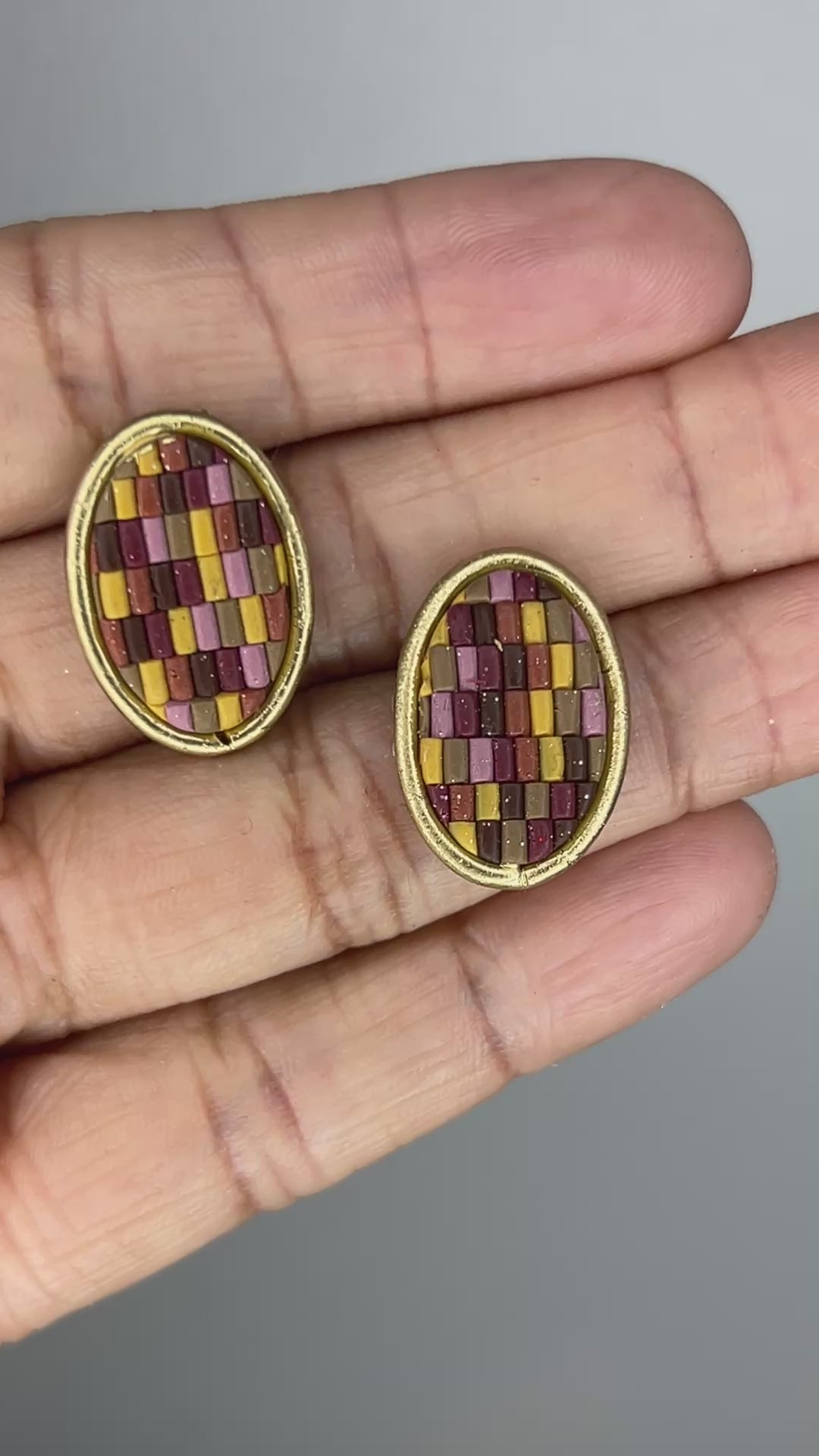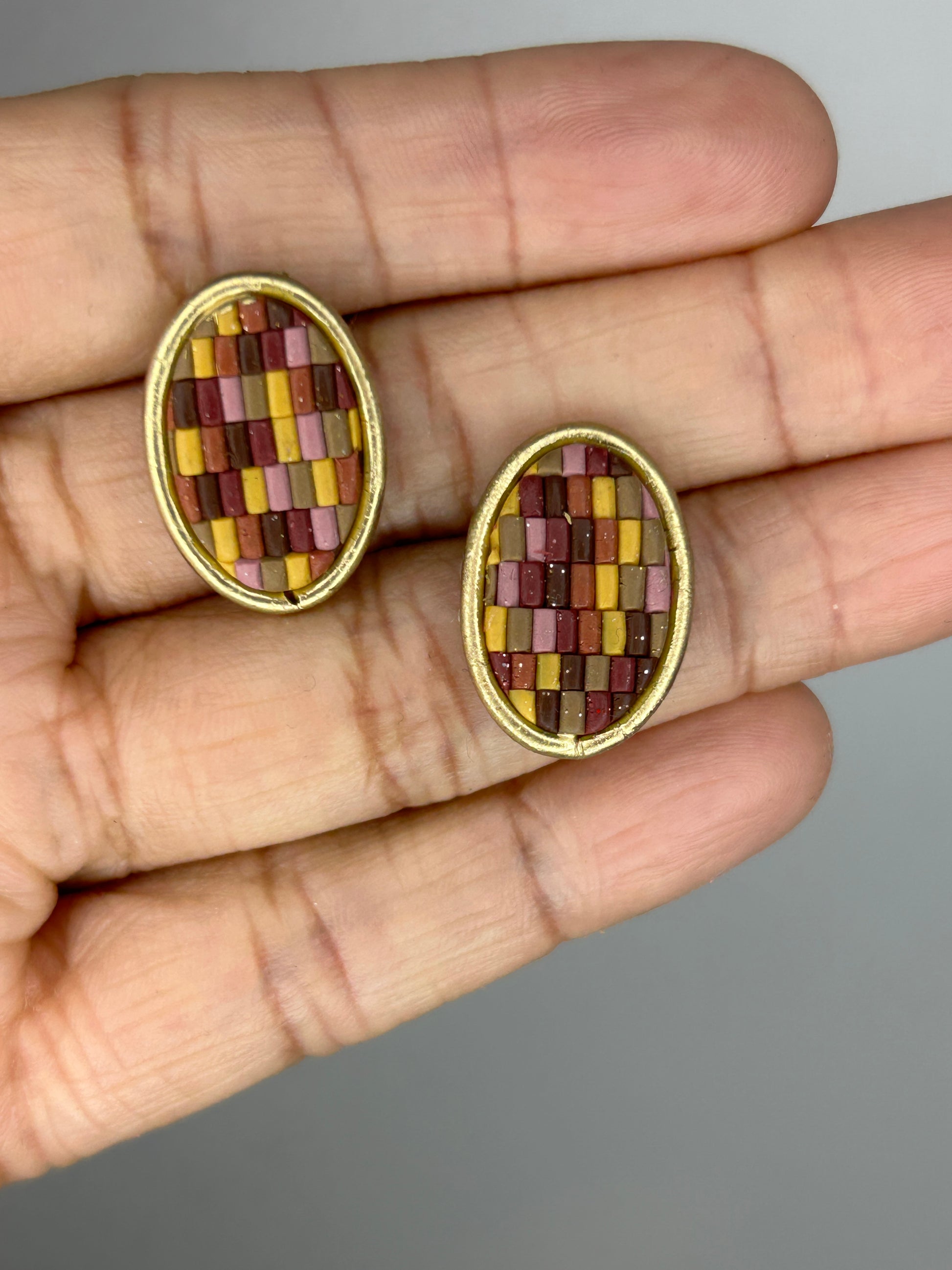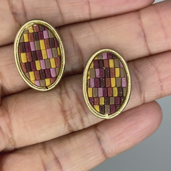 The Cozy Tones collection is all about warmth, comfort, and those soft autumn textures we love. Each pair is crafted with a beautiful sweater-knit design in rich seasonal colors—terracotta, burgundy, tan, chocolate, mustard, and mauve pink—each with a delicate shimmer that catches the light just right. Some pieces are accented with elegant gold edges or tiny gold rings for a subtle touch of charm. These small, handcrafted earrings bring the perfect cozy vibe to your everyday style, making fall feel wearable all year long