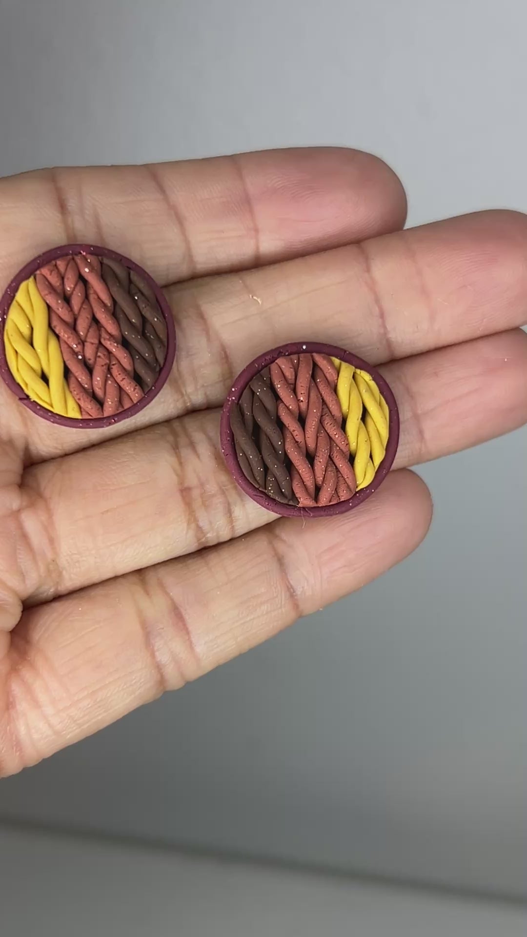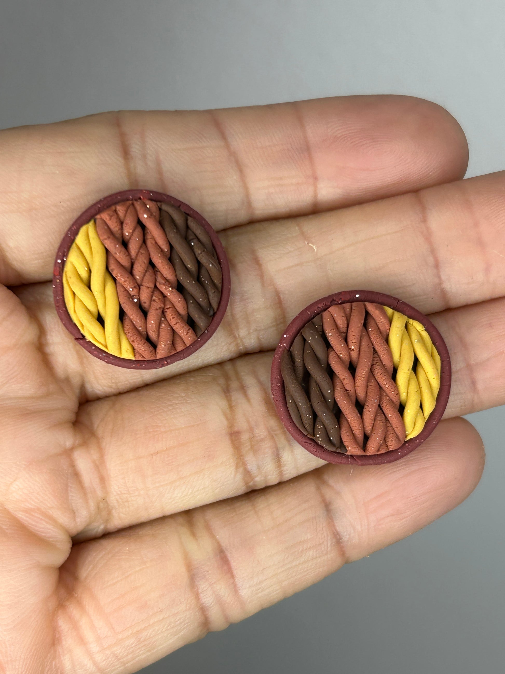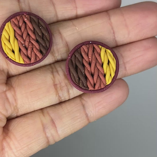 The Cozy Tones collection is all about warmth, comfort, and those soft autumn textures we love. Each pair is crafted with a beautiful sweater-knit design in rich seasonal colors—terracotta, burgundy, tan, chocolate, mustard, and mauve pink—each with a delicate shimmer that catches the light just right. Some pieces are accented with elegant gold edges or tiny gold rings for a subtle touch of charm. These small, handcrafted earrings bring the perfect cozy vibe to your everyday style, making fall feel wearable all year long