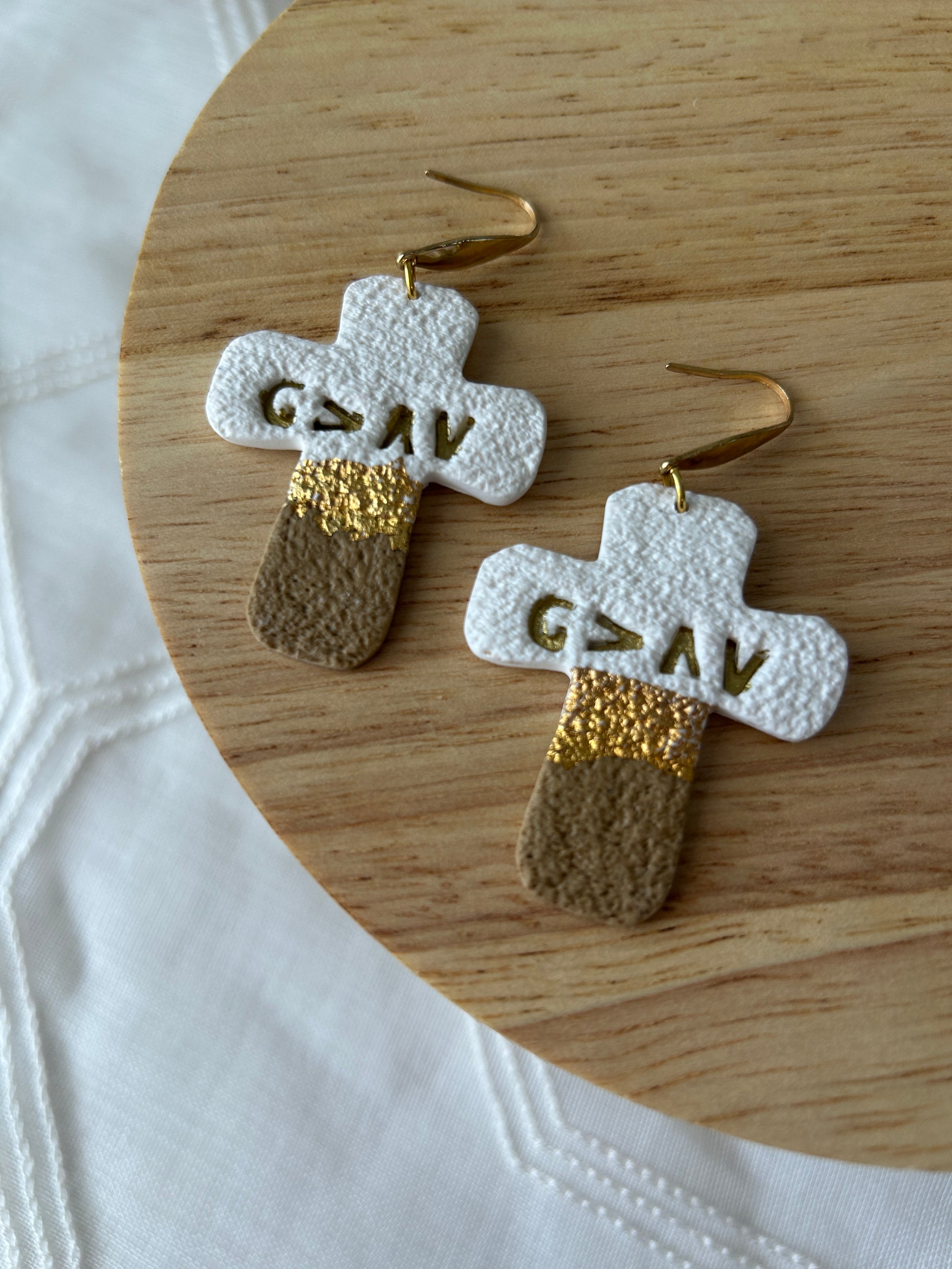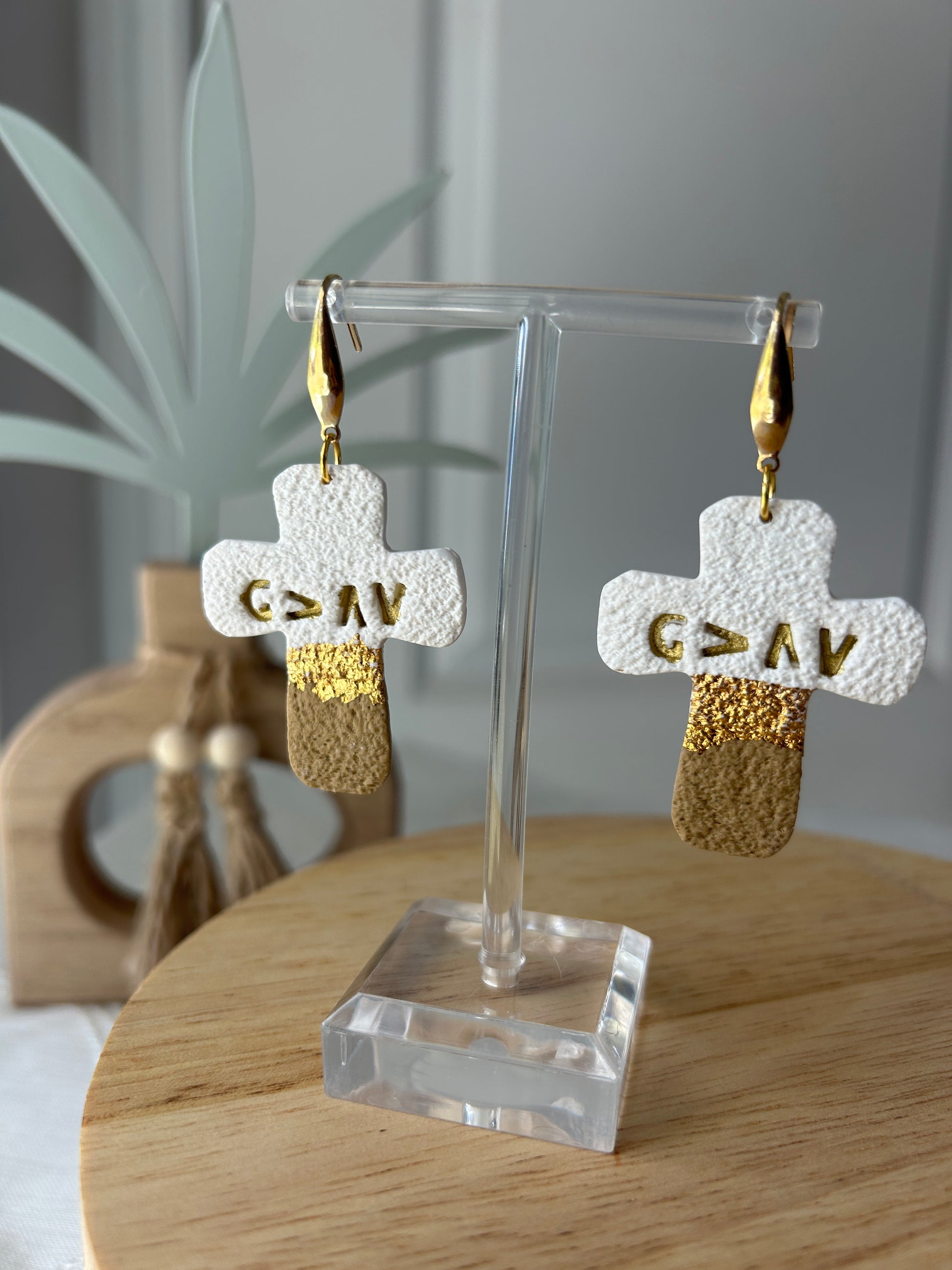 God is Greater than the Highs and Lows" symbol, these earrings are a beautiful reminder of strength, trust, and faith through every season. Handcrafted in calming tones of white, gold, and tan, each piece blends simplicity with meaning. Wear them as a daily encouragement or gift them to someone who needs a reminder of God’s steady presence.