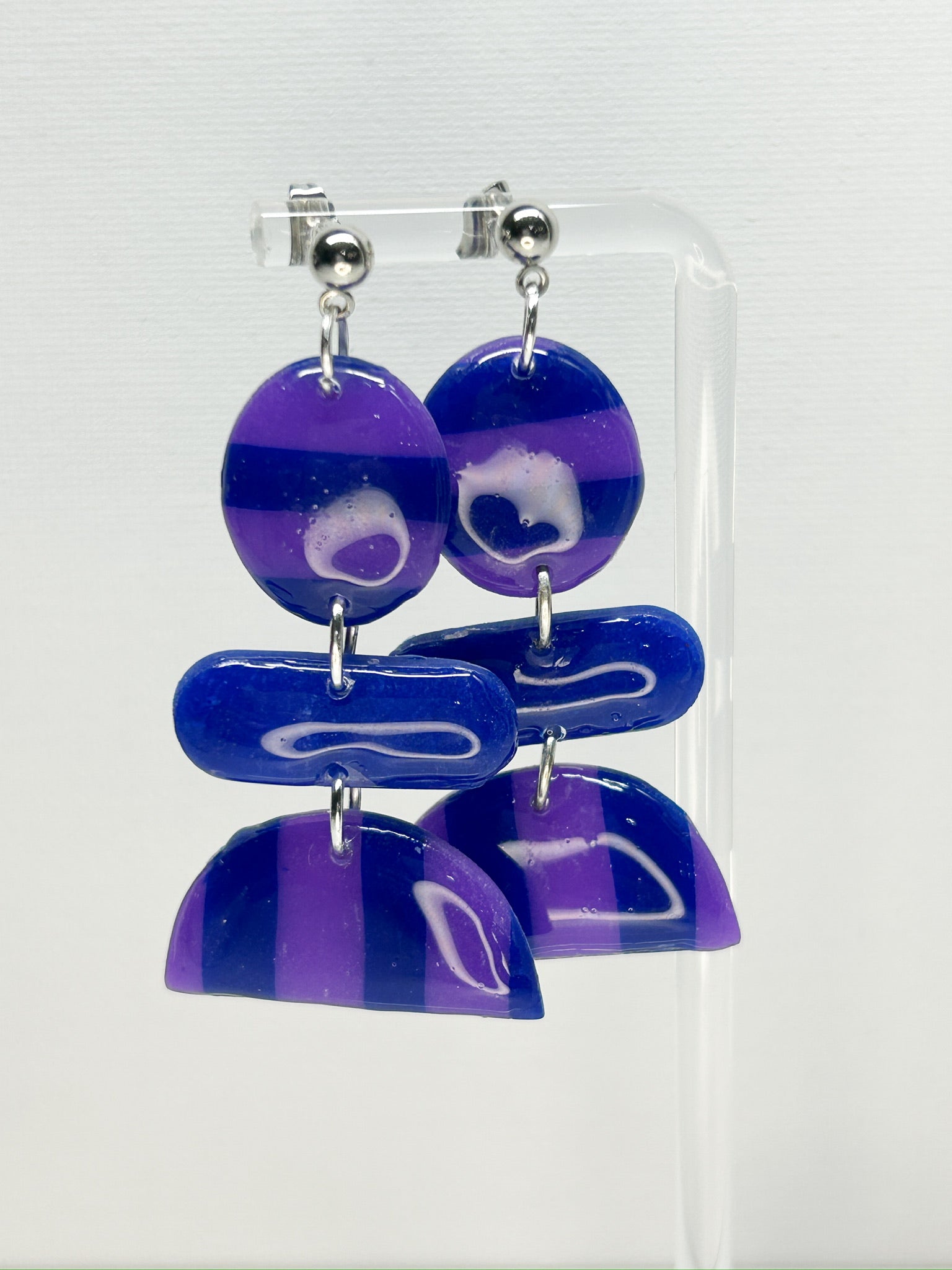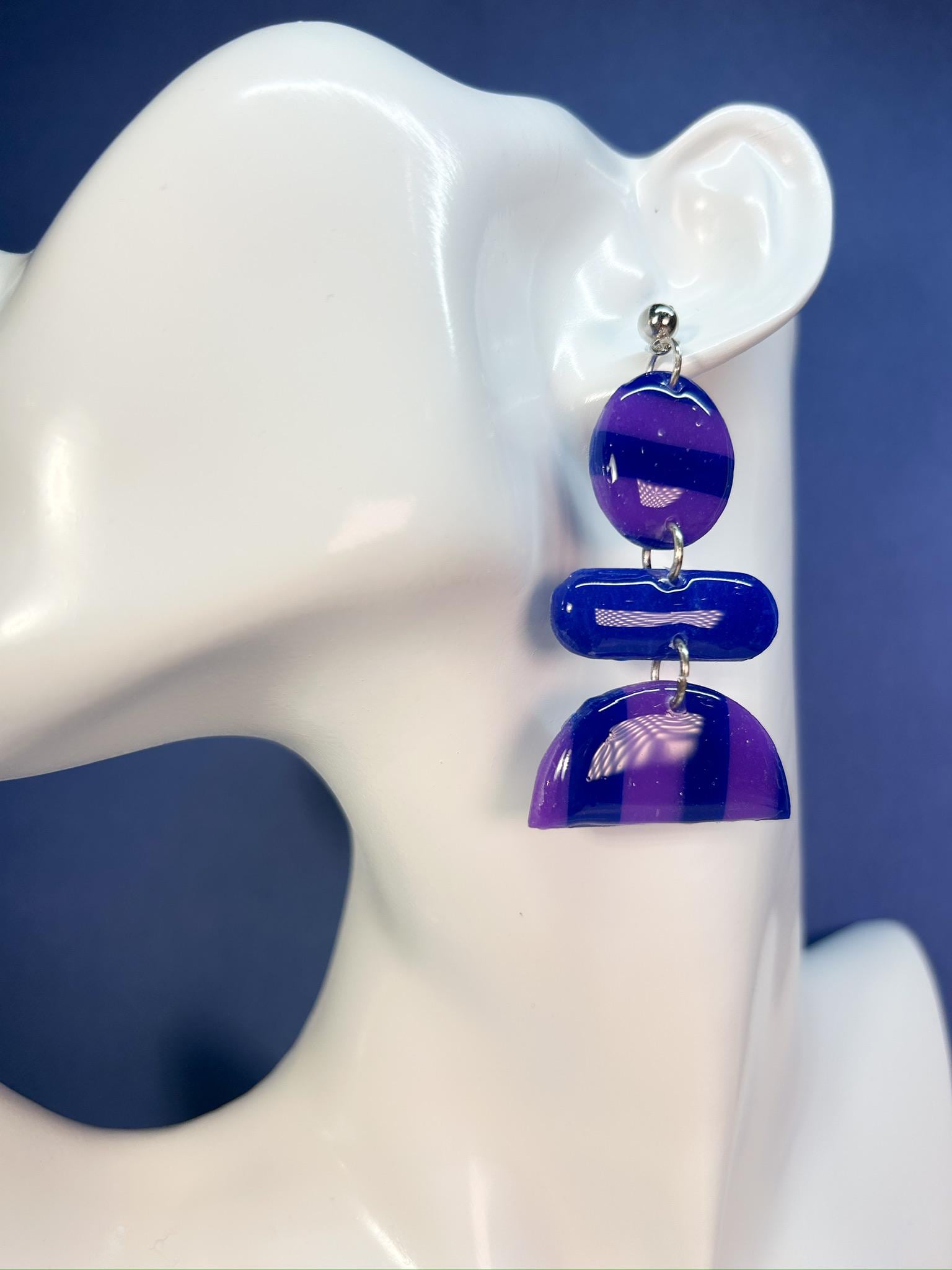 Turn heads with these mesmerizing translucent dark purple and royal blue striped polymer clay earrings! The bold fusion of colors creates an eye-catching, ethereal effect, perfect for making a statement. Handcrafted to perfection, each pair has a unique, celestial vibe that’s both modern and mystical. Lightweight and striking, these earrings are a limited-edition accessory designed to bring a touch of cosmic beauty to your look!