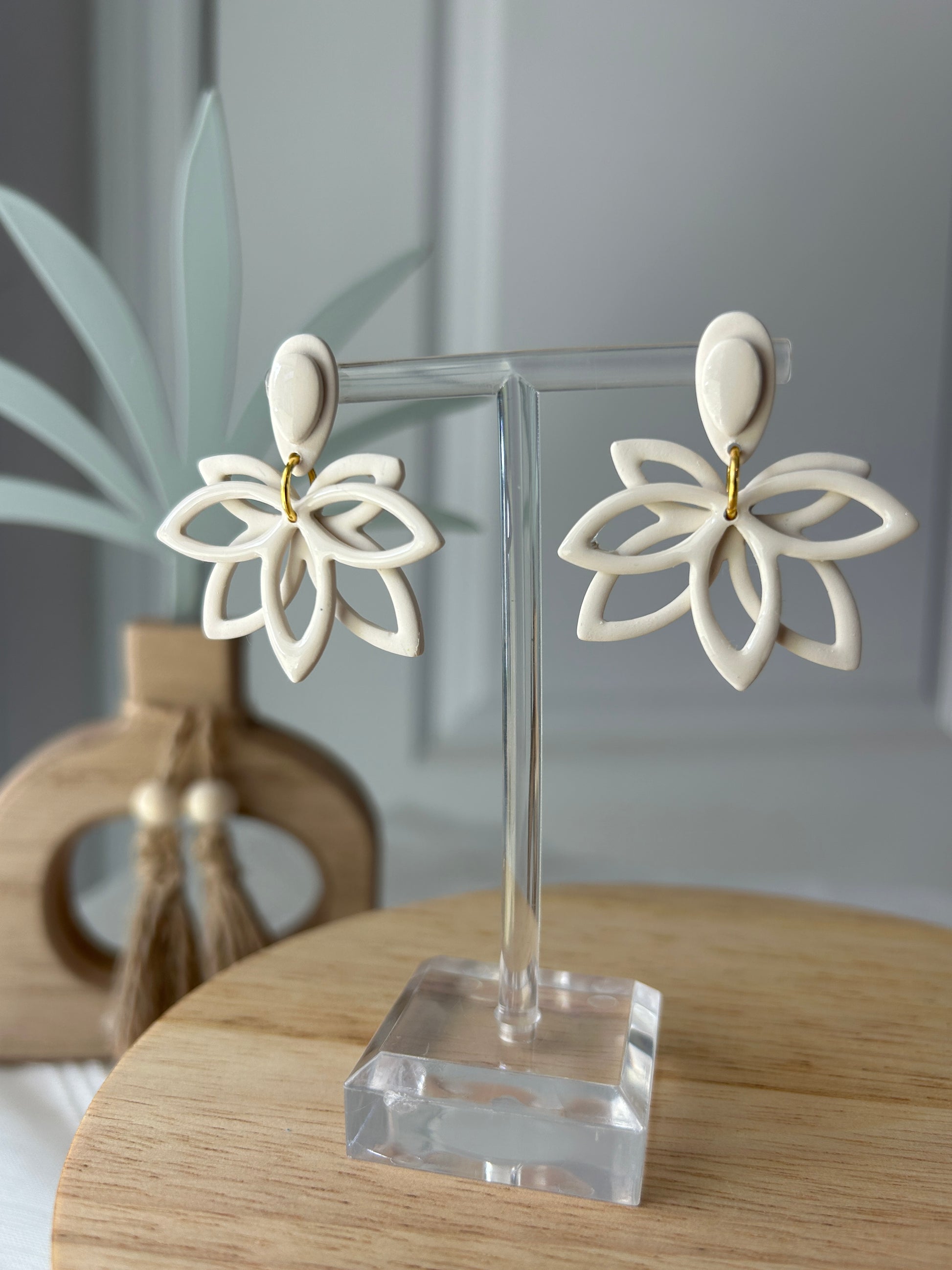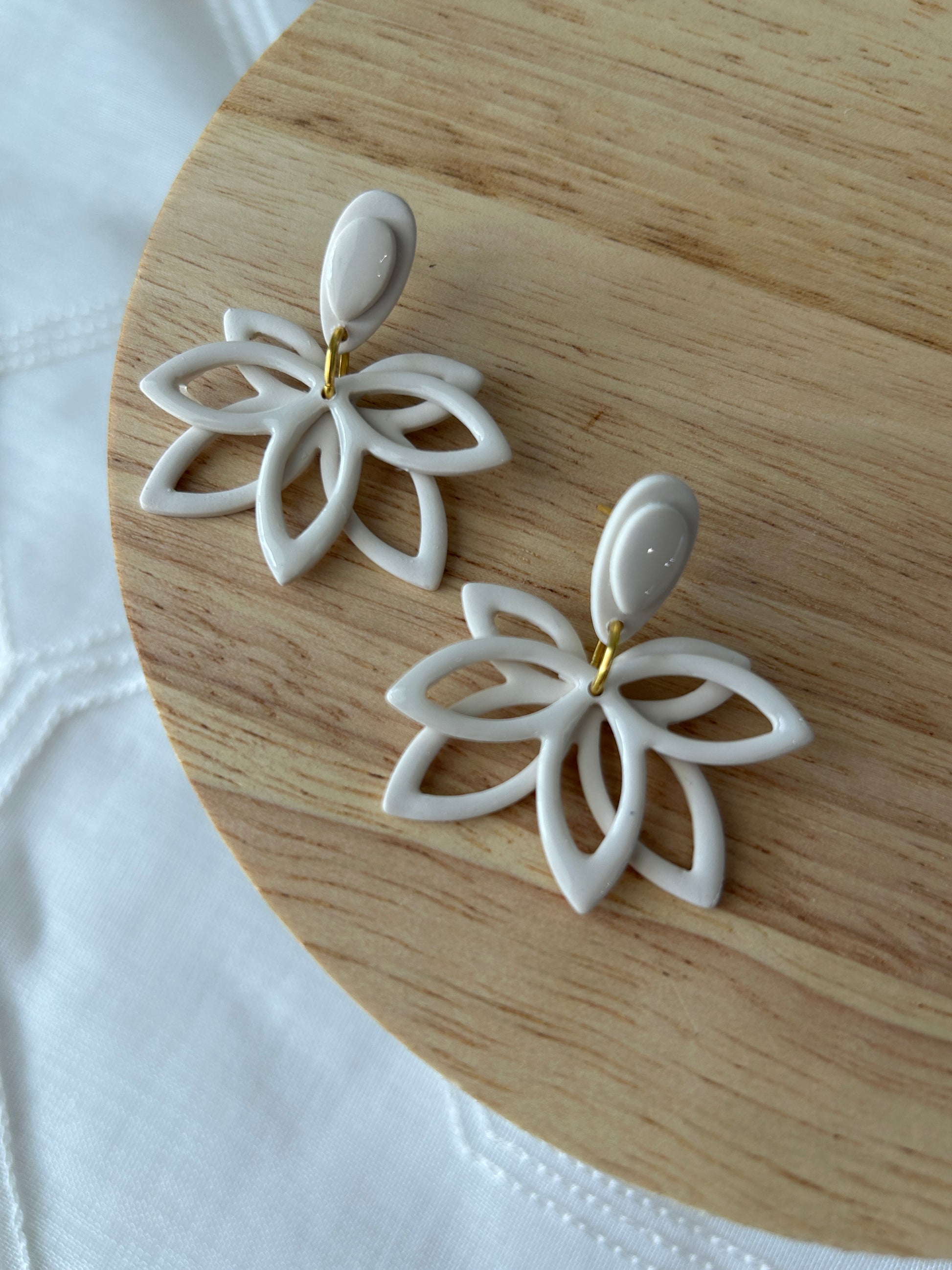 Introducing my Spring Neutral Bloom Collection,. A soft, earthy blend of neutral flower-shaped earrings in shades of cream—each designed with natural beauty in mind. Some pieces feature delicate gold leaves, wooden elements, touches of warm copper, or a unique sand-like texture for added depth and charm. Whether you're dressing up or keeping it casual, these earrings bring timeless elegance with a grounded, organic feel.