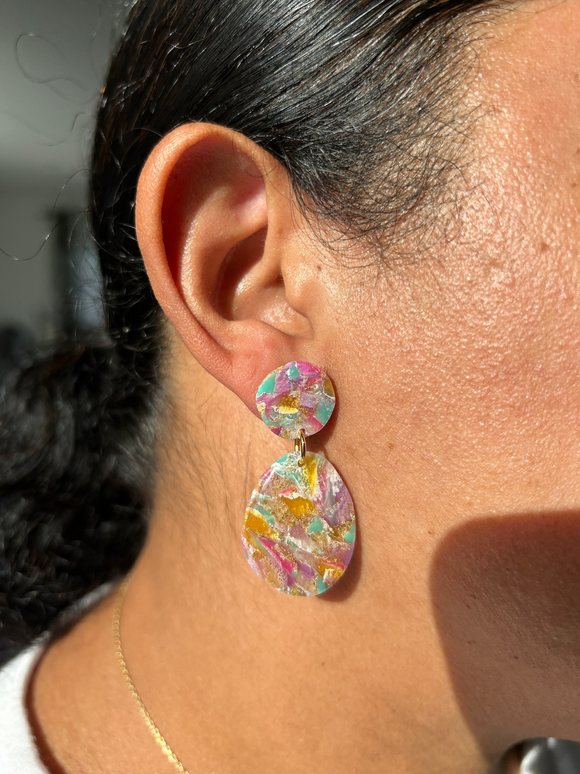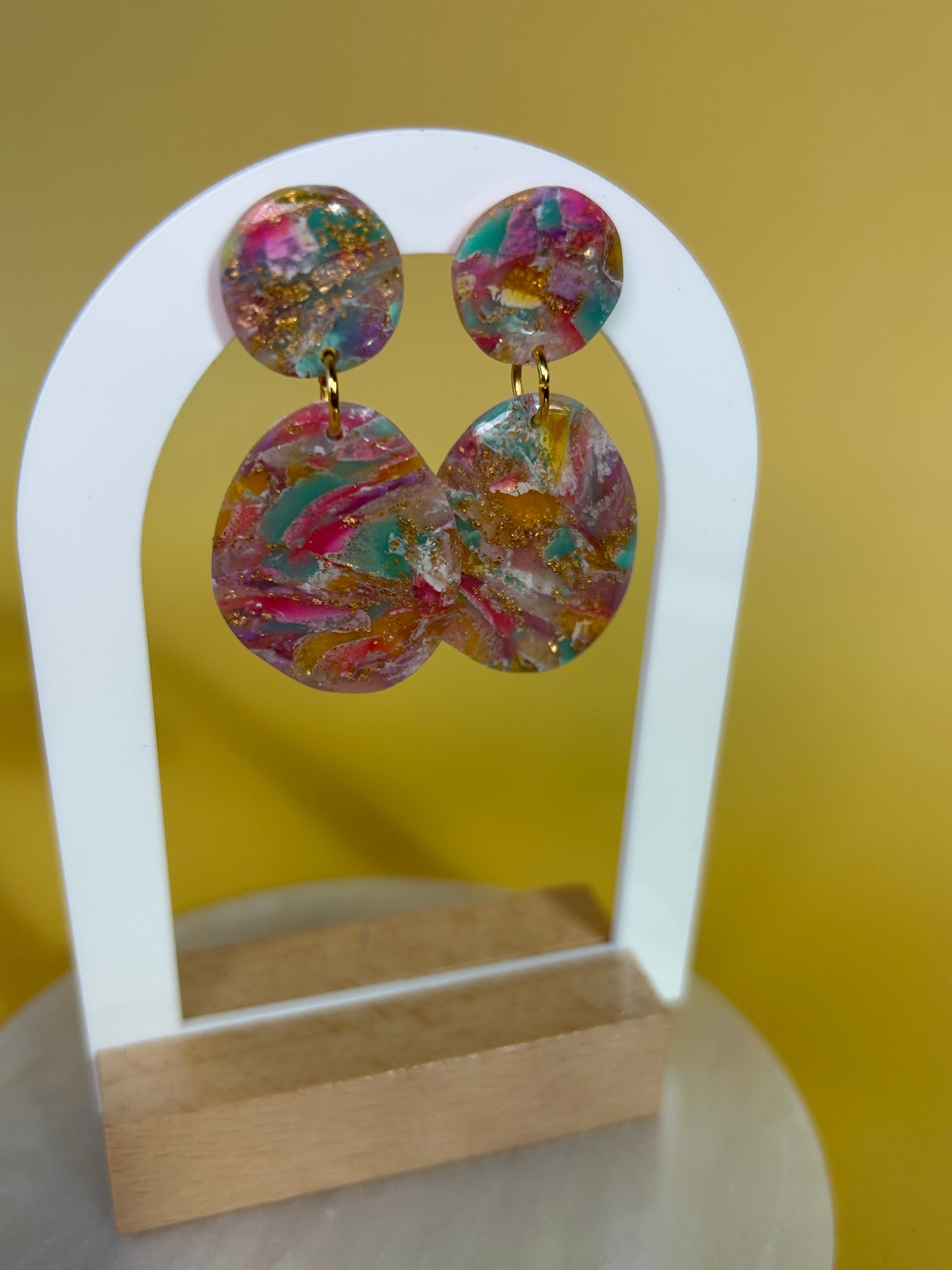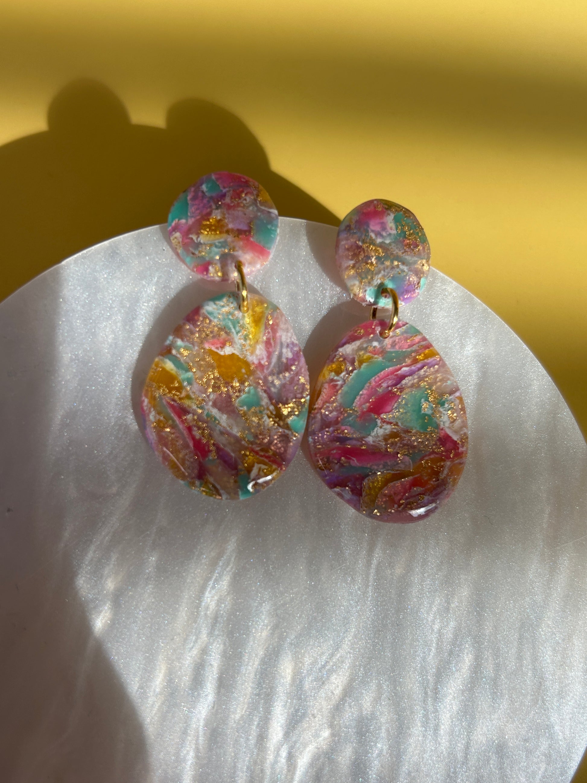 Introducing my Vibrant Retro Collection! A vibrant fusion of translucent layers in pink, purple, yellow, turquoise, and white stripes—each piece accented with shimmering hints of gold. Some designs feature real dried flowers sealed inside for a natural, ethereal touch, while others sparkle with a delicate diamond detail. Light-catching, joyful, and full of personality, these earrings are a celebration of color, nature, and springtime beauty.