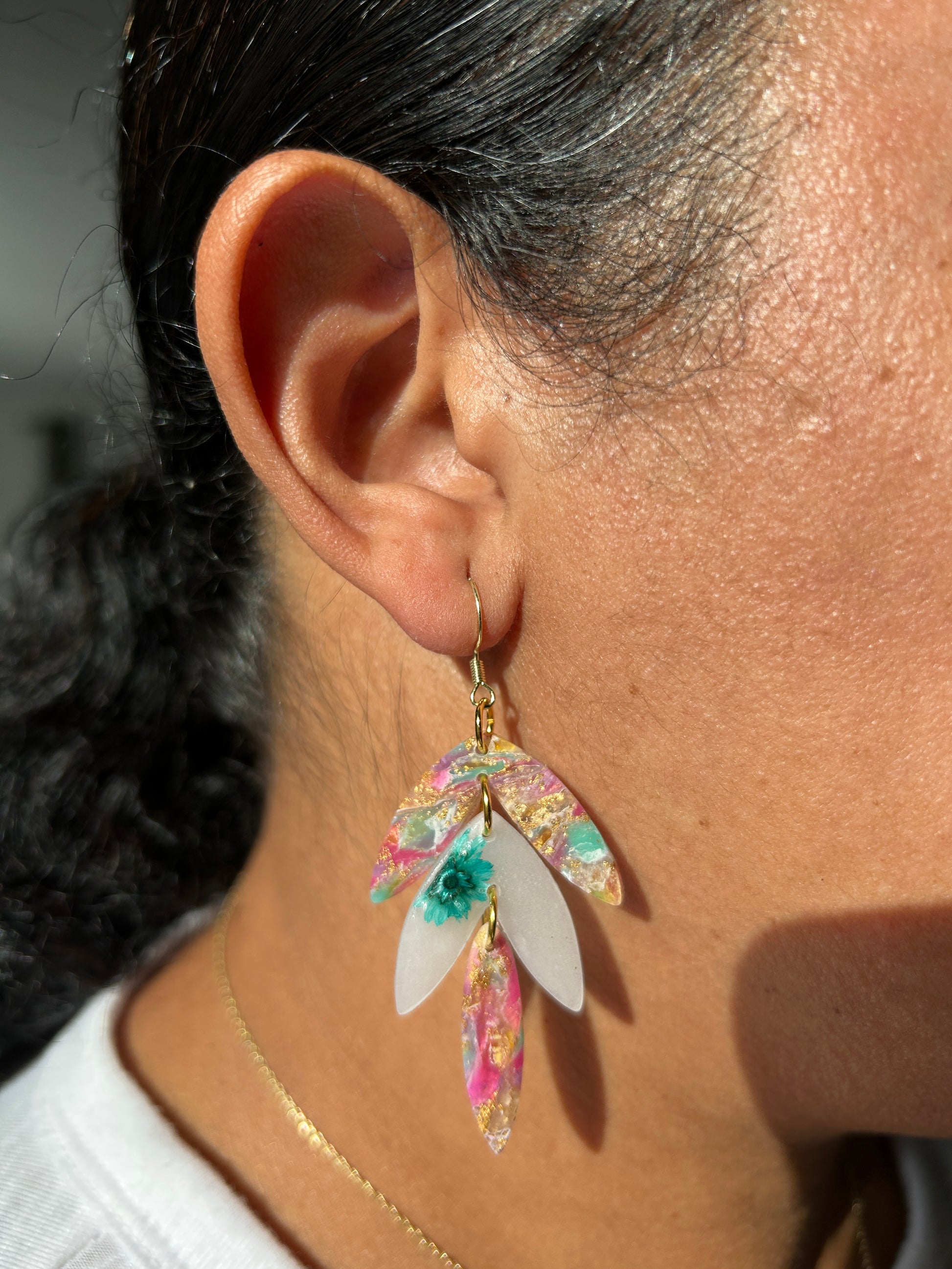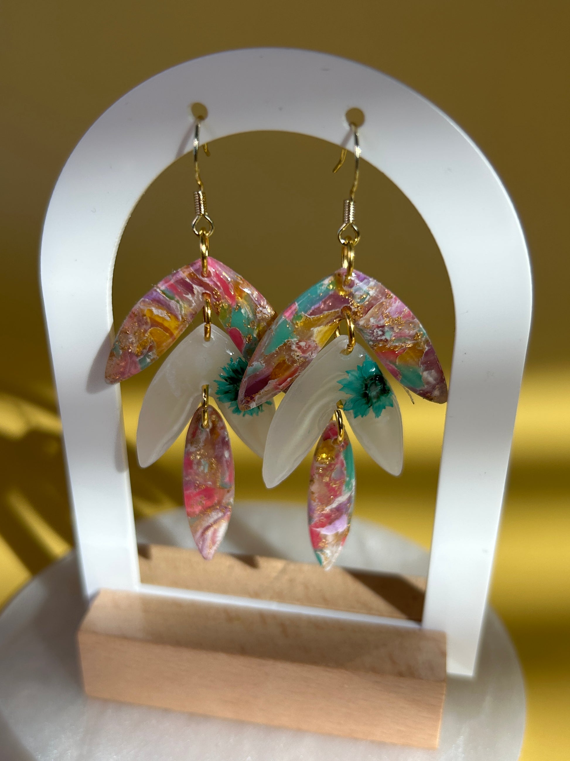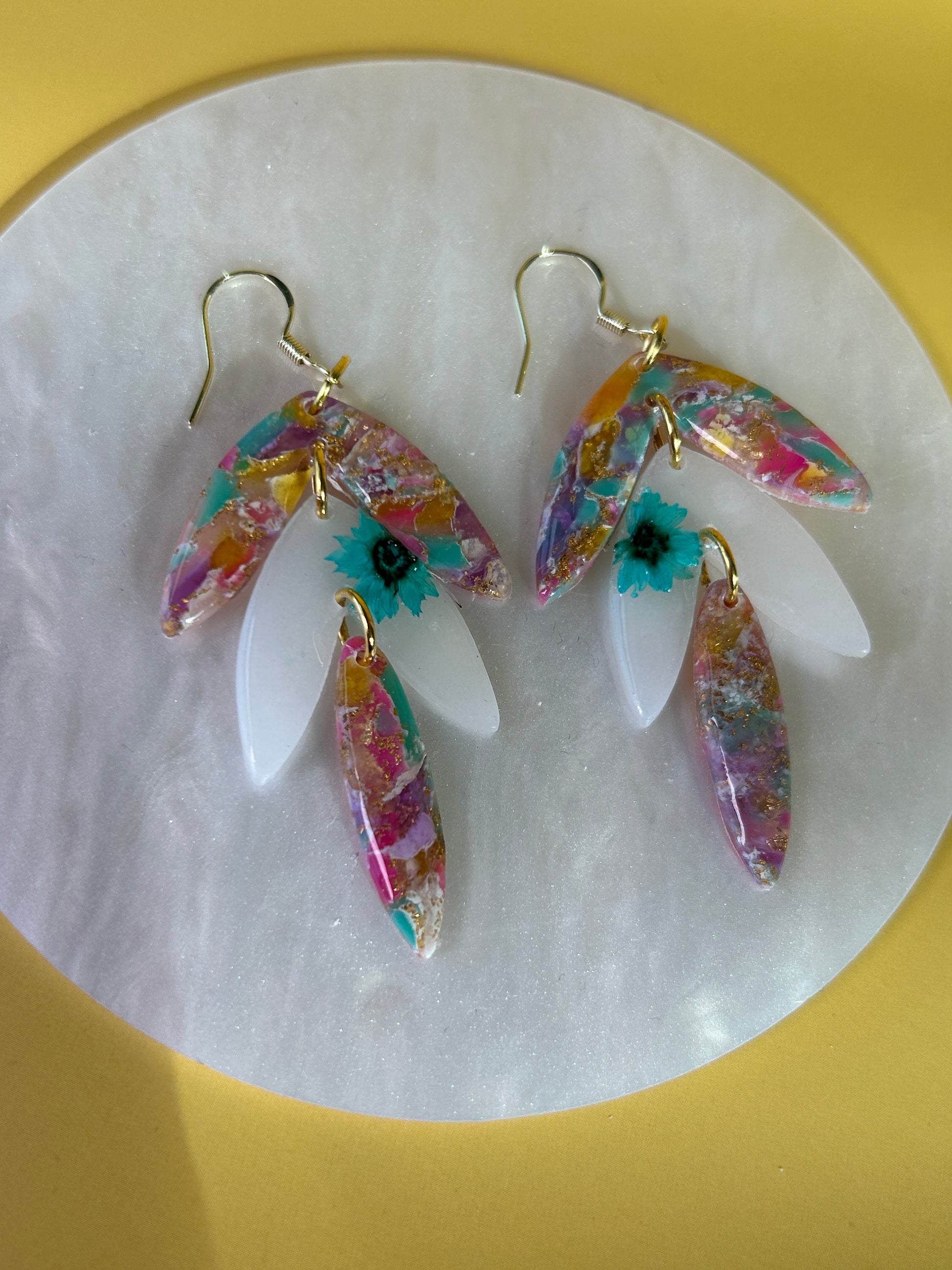 Introducing my Vibrant Retro Collection! A vibrant fusion of translucent layers in pink, purple, yellow, turquoise, and white stripes—each piece accented with shimmering hints of gold. Some designs feature real dried flowers sealed inside for a natural, ethereal touch, while others sparkle with a delicate diamond detail. Light-catching, joyful, and full of personality, these earrings are a celebration of color, nature, and springtime beauty.
