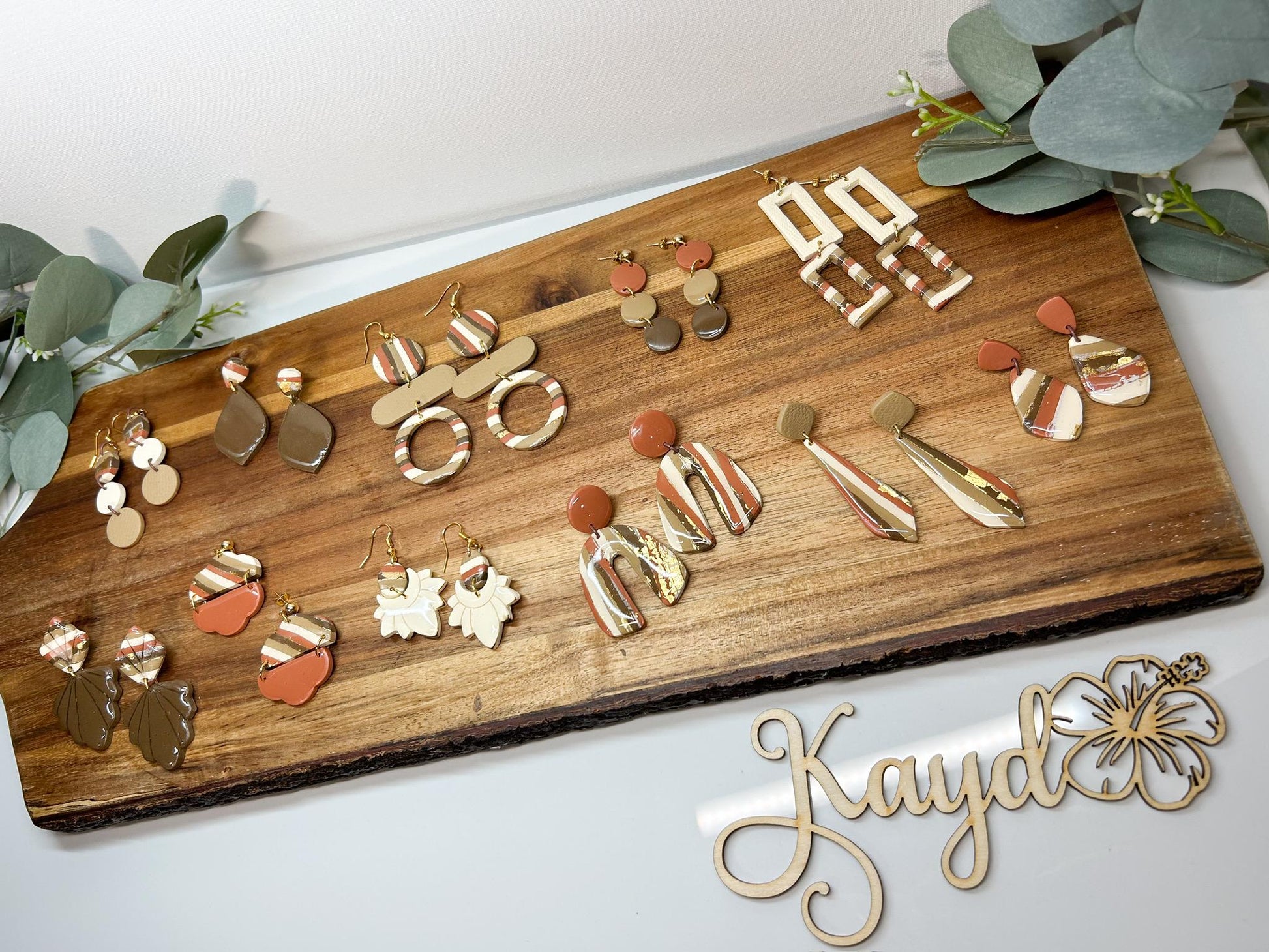 These cream, brown, terracotta, gold, and tan earrings are a stunning blend of earthy tones and natural elegance. Each piece is thoughtfully crafted to evoke warmth and sophistication, making them perfect for those who love neutral, versatile accessories. Handcrafted from polymer clay with a touch of gold shimmer, these earrings offer a timeless appeal that effortlessly complements any outfit. Lightweight and unique, they bring a subtle yet striking beauty that reflects both nature and refined style.